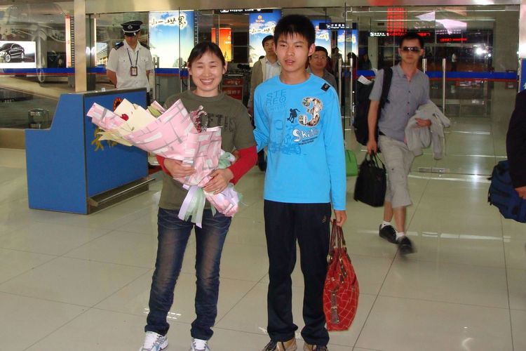 我中心秦瑜老師幫李道霞推起行李車(chē),李道霞兒子也幫媽媽拎著包。