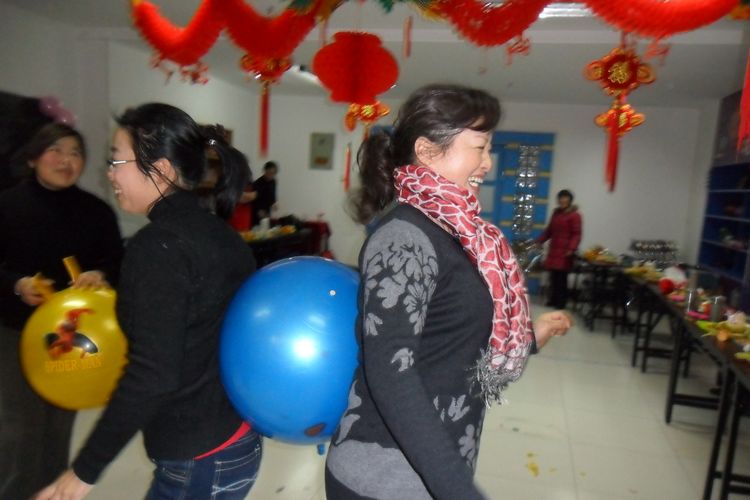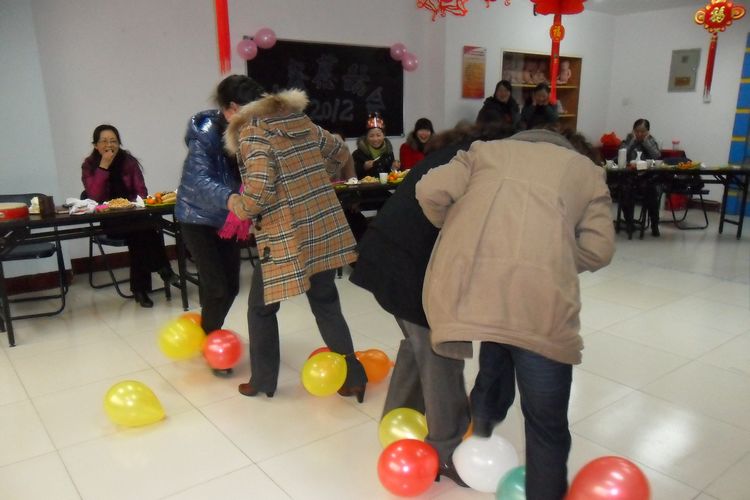 新春茶話會(huì)氣氛熱烈,大家又玩起了傳送氣球游戲。